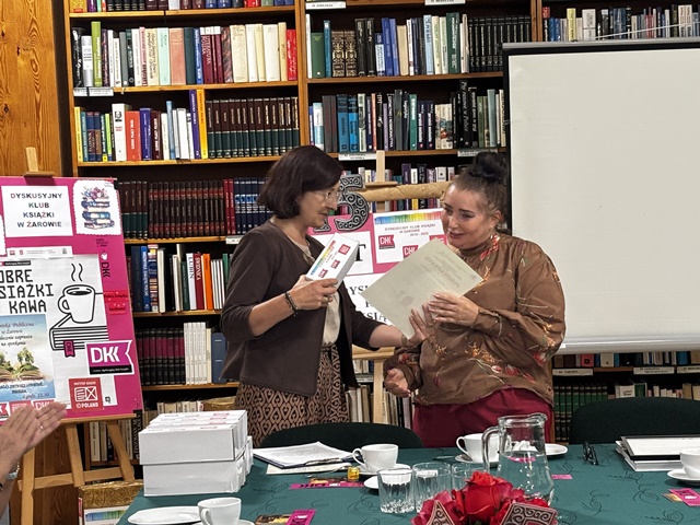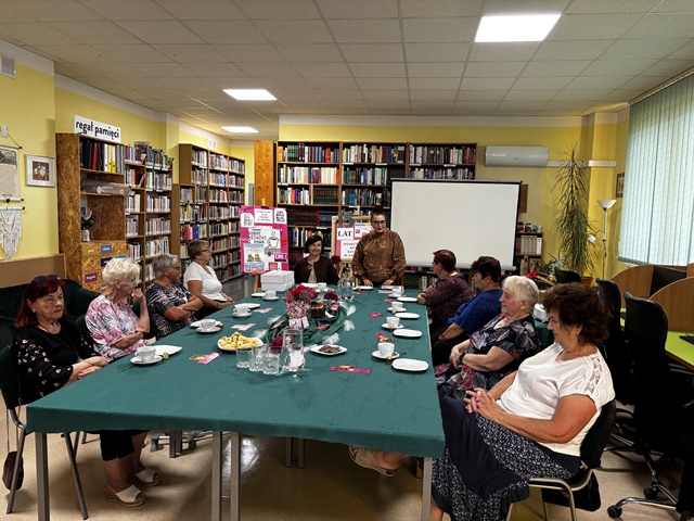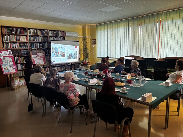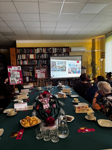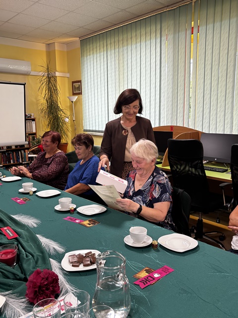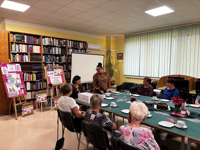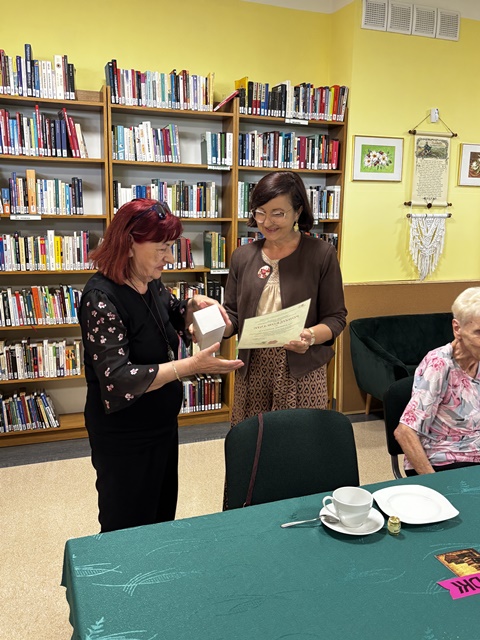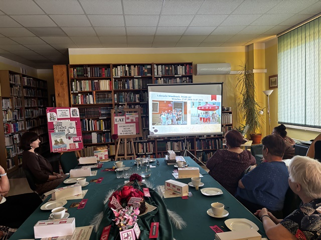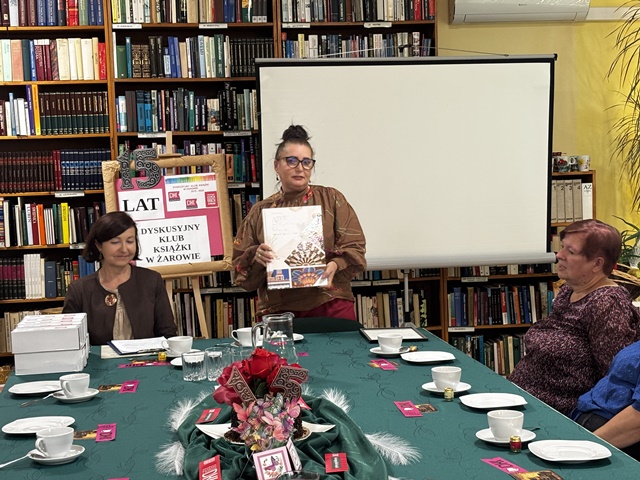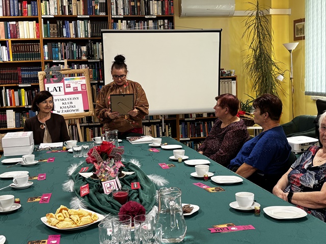 Następnie Klubowiczki otrzymały podziękowania od Moderatorki Małgorzaty Gawron oraz prezenty przesłane przez Koordynatorki DKK. Po czym obejrzałyśmy prezentację pt.: „Dyskusyjny Klub Książki w Żarowie 2010-2025” – gdzie można było zobaczyć zdjęcia z okresu 15 lat jego działalności. Pierwsze spotkanie odbyło się 28 września 2010 r. a pierwsza z omawianych książek to „Sekrety” Hanny Bakuły. Klub powstał z myślą o osobach korzystających z Biblioteki Publicznej, które szukały miejsca, gdzie można wspólnie rozmawiać o książkach. Tak narodził się Dyskusyjny Klub Książki w Żarowie. Założycielką i Moderatorką przez 8 lat była ówczesna Dyrektor Biblioteki Stanisława Biernacka, a od 2019 r. Moderatorką jest Małgorzata Gawron. Na przestrzeni tych 15 lat kilkadziesiąt osób uczestniczyło w spotkaniach Klubu.Obecnie jest 10 Klubowiczek. Panie Jadwiga Koszeluk, Alicja Godek i Małgorzata Gawron są w nim od samego początku. Ogółem w ciągu 15 lat zorganizowano 129 spotkań, rozmawiano o 183 książkach. Dobór książek do dyskusji zawsze podyktowany jest gustami literackimi członkiń Klubu, głównie jest to literatura biograficzna, podróżnicza, reportaże oraz literatura beletrystyczna. Koordynatorem programu na poziomie ogólnopolskim, który realizuje strategiczne cele związane z promocją czytelnictwa i literatury jest Instytut Książki. Biblioteki wojewódzkie realizują program dotacyjny i są kluczowymi partnerami Instytutu Książki w organizowaniu DKK w swoich regionach. Natomiast biblioteki publiczne (lokalne) są organizatorami poszczególnych klubów, które mogą działać również przy innych instytucjach. Oprócz spotkań klubowych  w ramach programu DKK zorganizowano u nas 12 spotkań autorskich (finansowanych lub współfinansowanych przez Instytut Książki). Byli u nas: