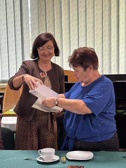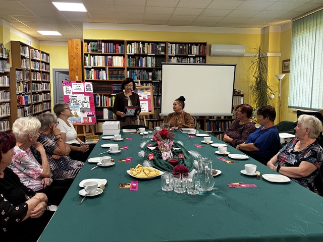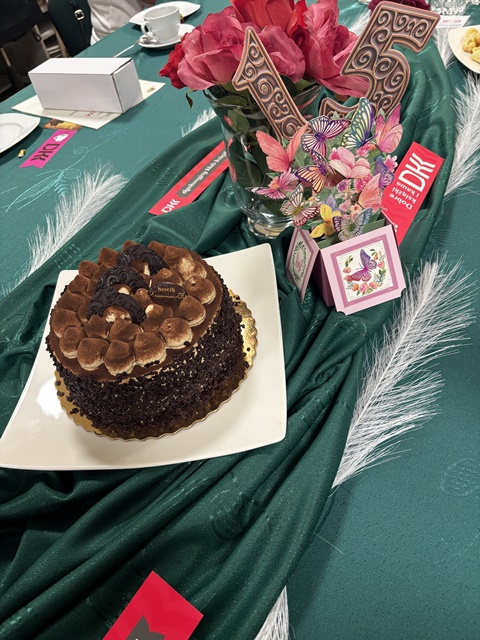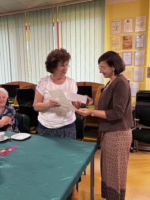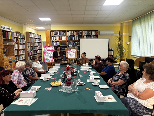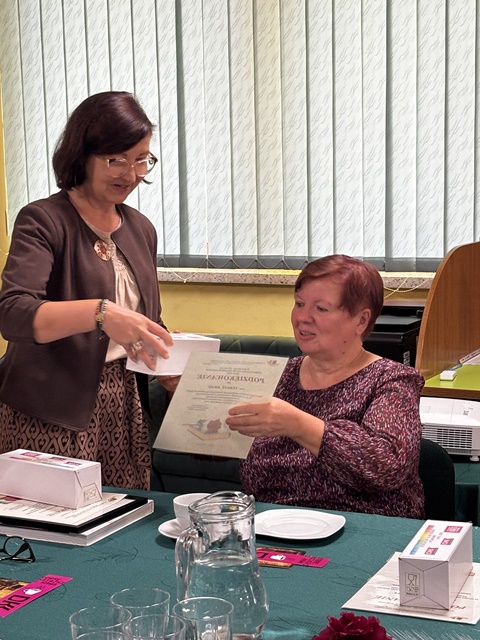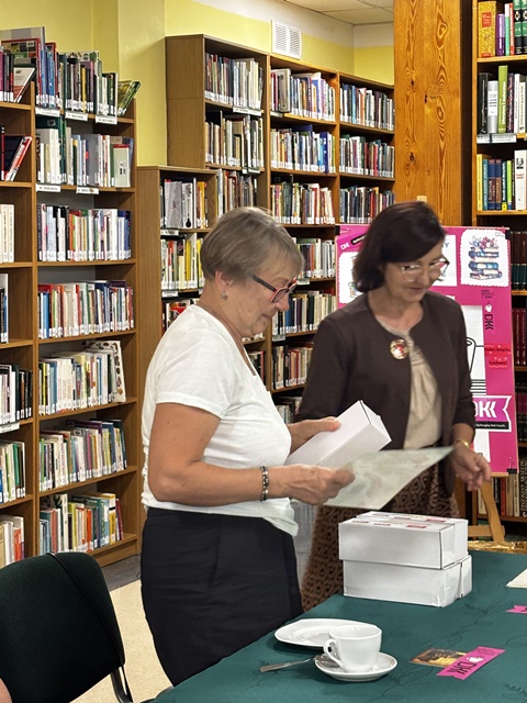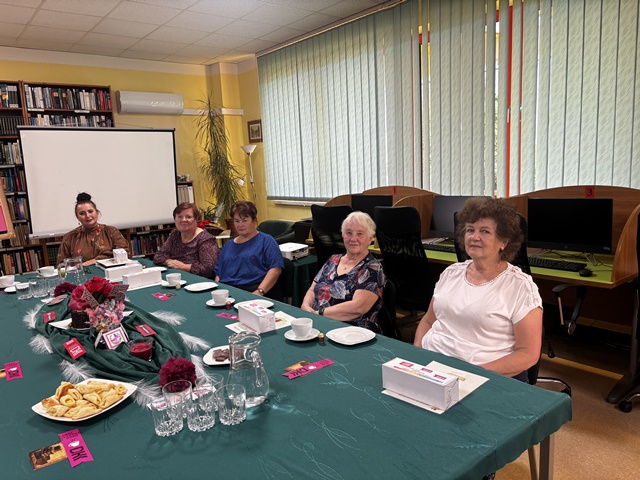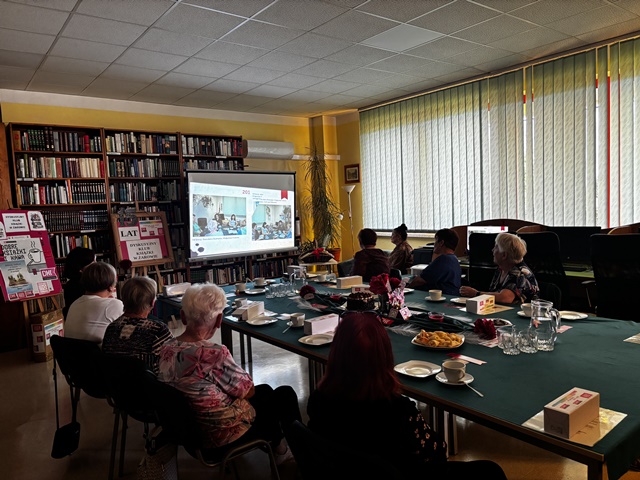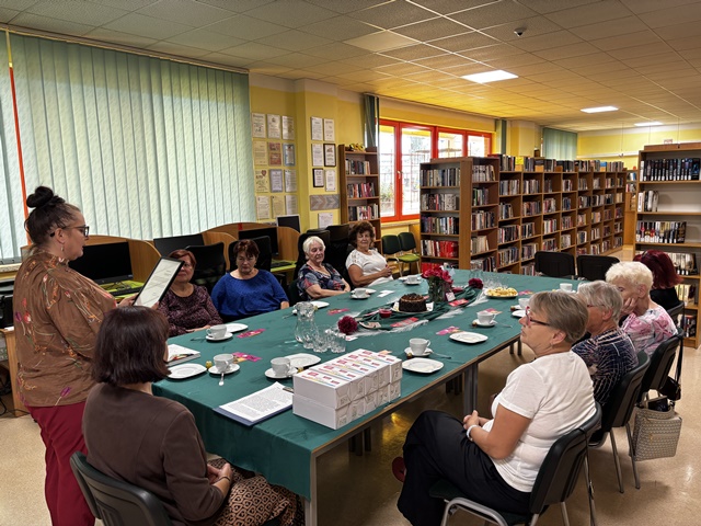 Następnie Klubowiczki otrzymały podziękowania od Moderatorki Małgorzaty Gawron oraz prezenty przesłane przez Koordynatorki DKK. Po czym obejrzałyśmy prezentację pt.: „Dyskusyjny Klub Książki w Żarowie 2010-2025” – gdzie można było zobaczyć zdjęcia z okresu 15 lat jego działalności. Pierwsze spotkanie odbyło się 28 września 2010 r. a pierwsza z omawianych książek to „Sekrety” Hanny Bakuły. Klub powstał z myślą o osobach korzystających z Biblioteki Publicznej, które szukały miejsca, gdzie można wspólnie rozmawiać o książkach. Tak narodził się Dyskusyjny Klub Książki w Żarowie. Założycielką i Moderatorką przez 8 lat była ówczesna Dyrektor Biblioteki Stanisława Biernacka, a od 2019 r. Moderatorką jest Małgorzata Gawron. Na przestrzeni tych 15 lat kilkadziesiąt osób uczestniczyło w spotkaniach Klubu.Obecnie jest 10 Klubowiczek. Panie Jadwiga Koszeluk, Alicja Godek i Małgorzata Gawron są w nim od samego początku. Ogółem w ciągu 15 lat zorganizowano 129 spotkań, rozmawiano o 183 książkach. Dobór książek do dyskusji zawsze podyktowany jest gustami literackimi członkiń Klubu, głównie jest to literatura biograficzna, podróżnicza, reportaże oraz literatura beletrystyczna. Koordynatorem programu na poziomie ogólnopolskim, który realizuje strategiczne cele związane z promocją czytelnictwa i literatury jest Instytut Książki. Biblioteki wojewódzkie realizują program dotacyjny i są kluczowymi partnerami Instytutu Książki w organizowaniu DKK w swoich regionach. Natomiast biblioteki publiczne (lokalne) są organizatorami poszczególnych klubów, które mogą działać również przy innych instytucjach. Oprócz spotkań klubowych  w ramach programu DKK zorganizowano u nas 12 spotkań autorskich (finansowanych lub współfinansowanych przez Instytut Książki). Byli u nas: