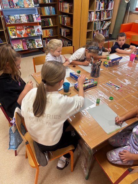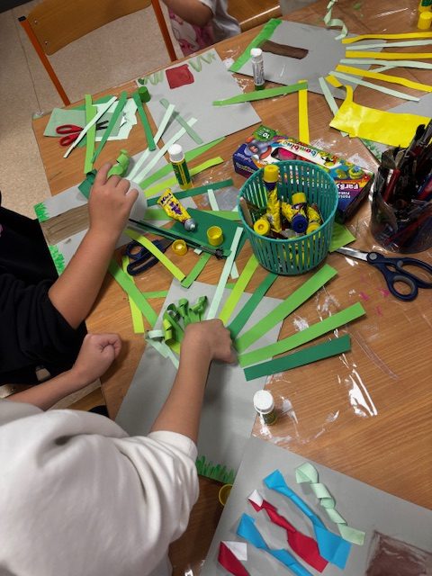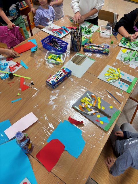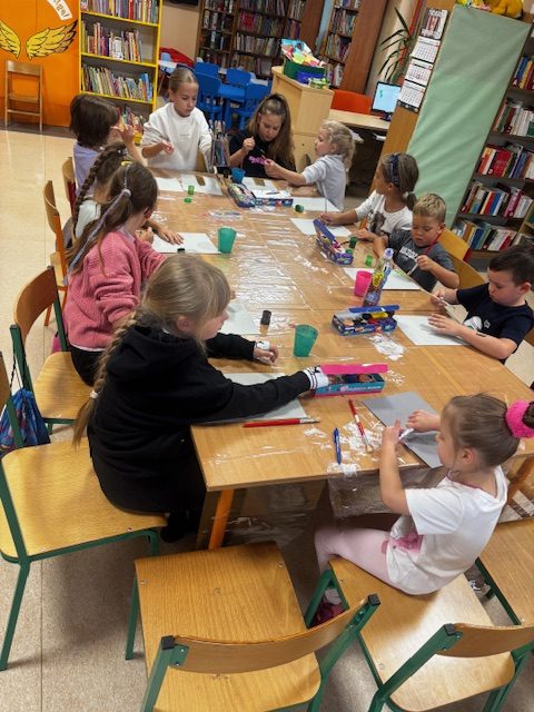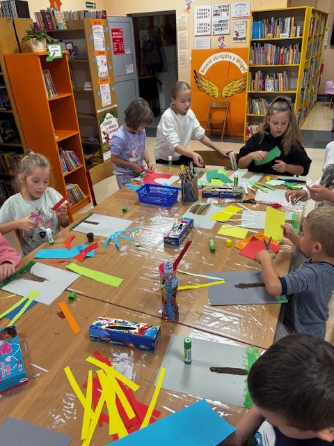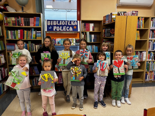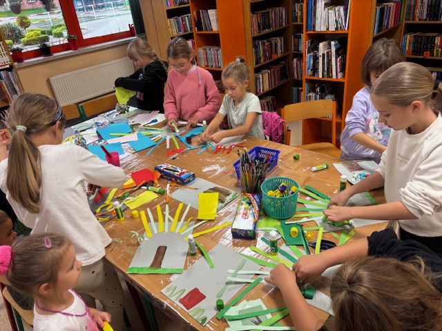 Podczas ostatnich zajęć Zręczne Łapki uczestnicy przenieśli się w jesienny klimat, tworząc piękne, barwne prace plastyczne. Na początku za pomocą farb przygotowali na kartkach tło – trawę i korę drzewa. Następnie z kolorowego papieru wycinali paseczki, które przyklejali do pracy, a później wykręcali i mocowali drugą końcówkę do pnia drzewa, tworząc wspaniałe, trójwymiarowe korony. Na zakończenie dodali drobne skrawki papieru, które wyglądały jak spadające z drzew liście, co nadało pracom jeszcze więcej uroku i realizmu. Efektem końcowym były niezwykłe, kolorowe jesienne drzewa – prawdziwe małe dzieła sztuki, które wprowadziły do biblioteki ciepły, jesienny nastrój.