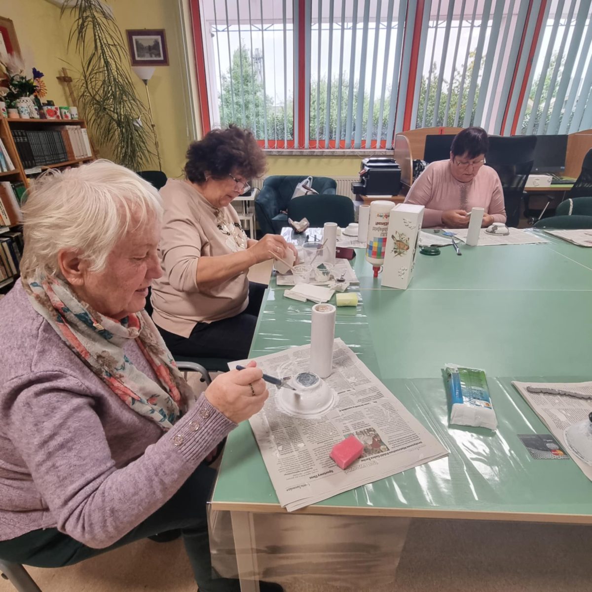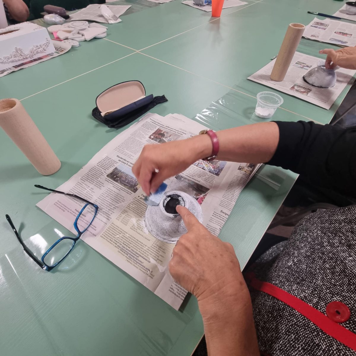 Zajęcia obejmowały przygotowanie drewnianych świeczników do pracy – uczestnicy szlifowali powierzchnie, gruntowali je i poznawali podstawowe zasady techniki. Następnie skupiono się na doborze motywów, komponowaniu wzorów oraz precyzyjnym nakładaniu elementów dekoracyjnych. Ostatnie zajęcia poświęcono utrwalaniu i wykończeniu prac warstwami lakieru, a także prezentacji gotowych świeczników.