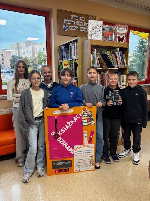 grupa młodzieży z książką oraz plakatem BiblioMoli