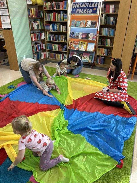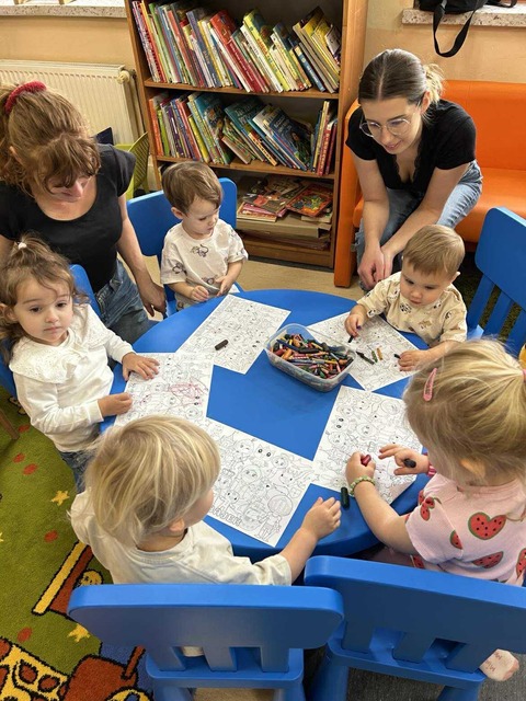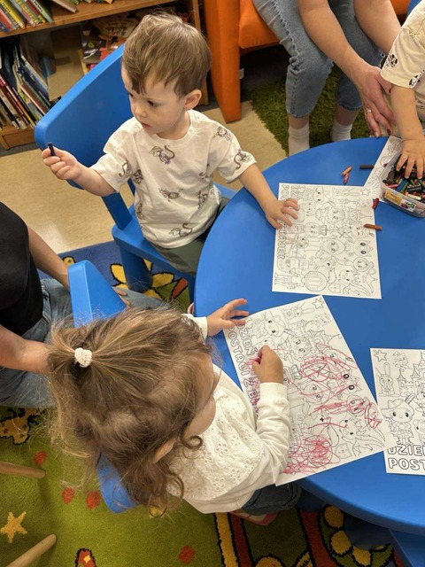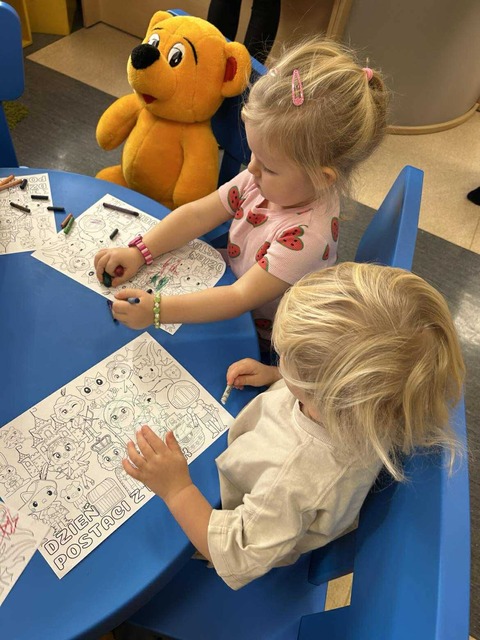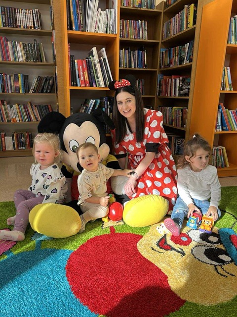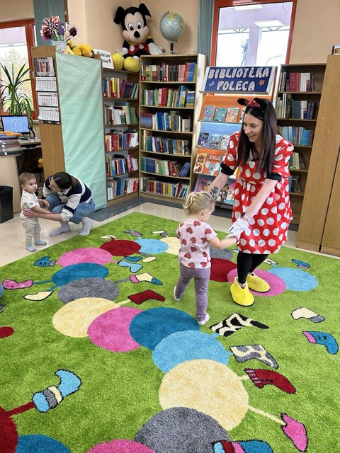 W ramach Maluszkowej Grupy Zabawowej odbyły się wyjątkowe zajęcia z okazji Dnia Postaci z Bajek, które poprowadziła… Myszka Minnie! Już od pierwszej chwili dzieci były zachwycone wizytą bajkowej bohaterki, co wprowadziło wszystkich w radosny, magiczny nastrój. Po tradycyjnych aktywnościach – zabawie z Chustą Klanzy, ruchowych zabawach „Kółko graniaste” i „Balonik” – przyszedł czas na chwilę relaksu. Podczas wierszyka Masażyka „Myszka i serek” maluszki odpoczywały, gdy ich opiekunowie wykonywali delikatny masażyk na pleckach. Następnie Myszka Minnie zaprosiła dzieci do świata książek, czytając opowieść „Myszka Minnie i przyjaciele”, która doskonale pasowała do tematyki zajęć. W części plastycznej maluszki kolorowały postacie z bajek, tworząc własne, barwne ilustracje znanych bohaterów. Nie zabrakło oczywiście także zabawy na dywanie, podczas której dzieci mogły bawić się swobodnie i integrować. To było pełne radości, kolorów i magii bajek spotkanie, które długo pozostanie w pamięci małych uczestników.