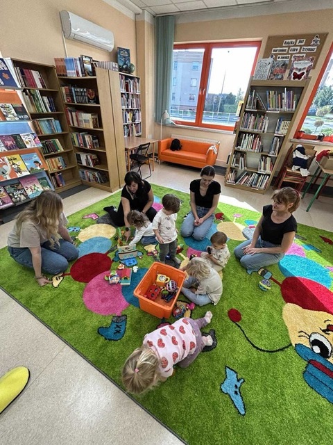 grupa dzieci z rodzicami siedzi na dywanie