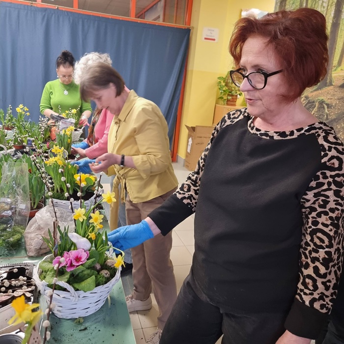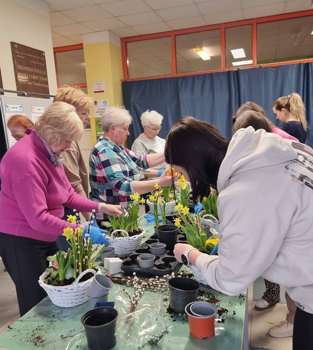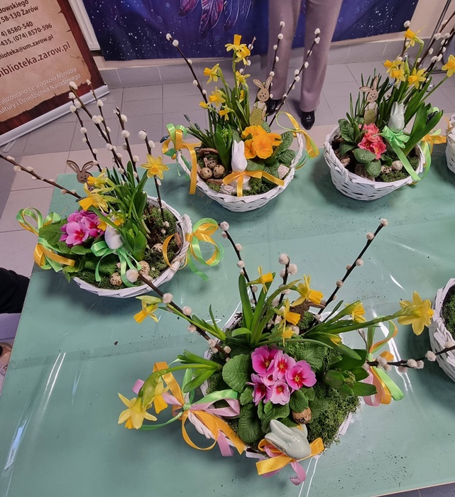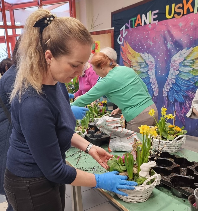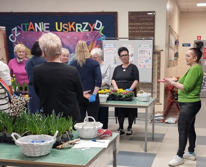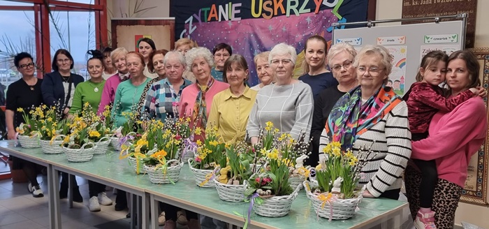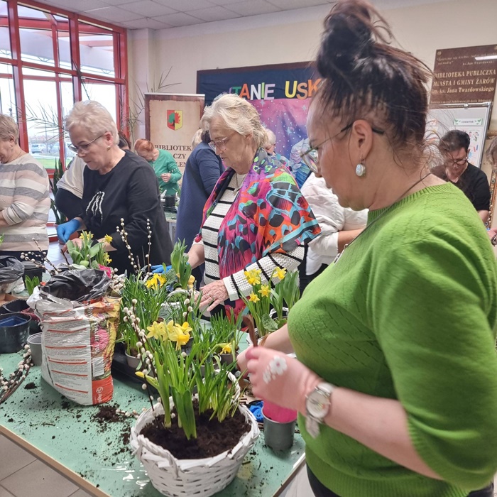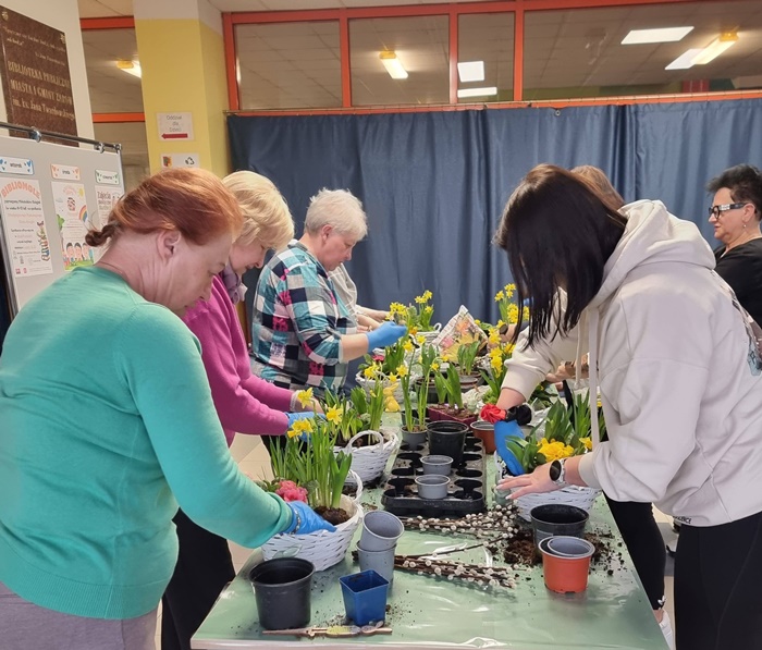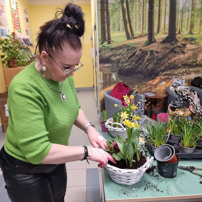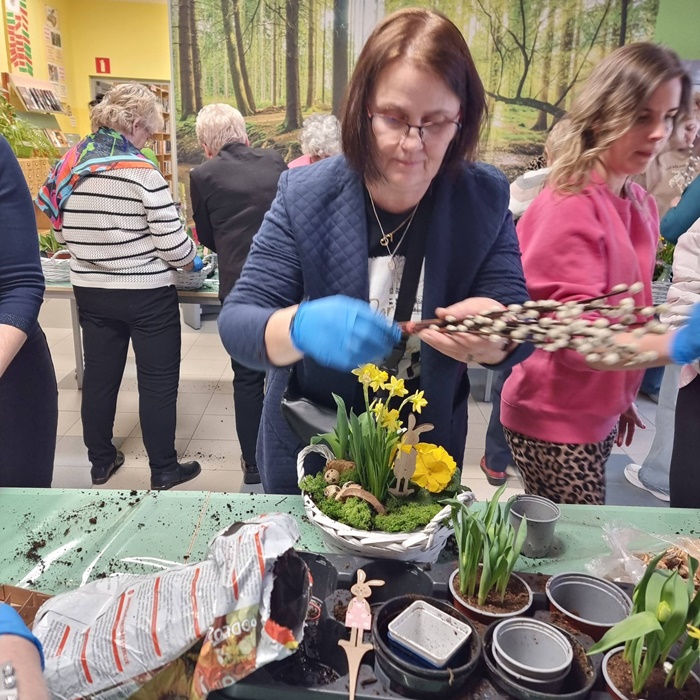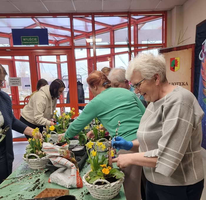 W bibliotece odbyły się warsztaty florystyczne dla mieszkańców, zorganizowane w ramach programu Polenergii „Gramy w zielone”. Wydarzenie miało na celu rozwijanie kompetencji twórczych oraz integrację społeczności lokalnej. Warsztaty prowadziła Pani Dyrektor biblioteki, zapewniając wsparcie merytoryczne oraz instruktaż na każdym etapie pracy. Uczestnicy przygotowywali wiosenno-wielkanocne kompozycje w koszyczkach, wykorzystując m.in. mini żonkile, szafirki, mini tulipany, hiacynty, prymulki, bazie oraz dekoracyjne zajączki i jajeczka. Zajęcia sprzyjały zdobywaniu praktycznych umiejętności florystycznych oraz aktywnemu spędzaniu czasu. W efekcie powstały estetyczne i starannie wykonane, przepiękne kompozycje, stanowiące wyraz zaangażowania uczestników oraz ich kreatywności. Realizacja warsztatów przyczyniła się do aktywizacji mieszkańców, a także wzmocnienia integracji społecznej i uczestnictwa w kulturze.