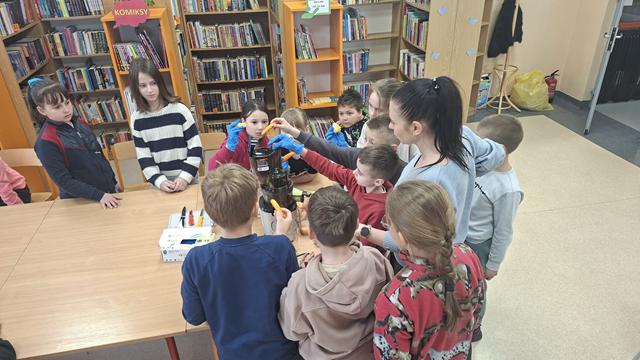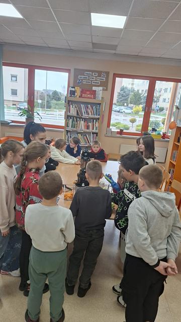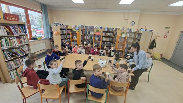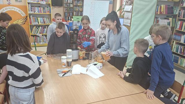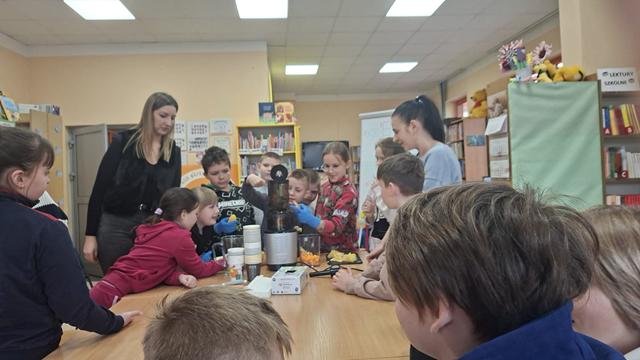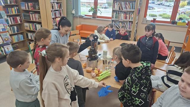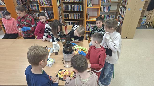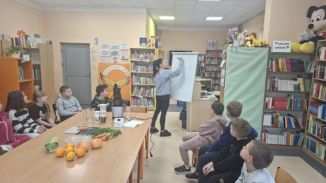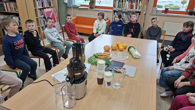 W Bibliotece odbyła się lekcja biblioteczna z udziałem uczniów klasy 3b ze Szkoły Podstawowej im. Jana Brzechwy w Żarowie. Zajęcia poświęcone były tematyce ekologii oraz zdrowego stylu życia. Na początku spotkania uczniowie rozmawiali o tym, czym jest środowisko i dlaczego warto o nie dbać. Wspólnie omawiano sposoby ochrony przyrody, takie jak oszczędzanie wody i energii elektrycznej, a także codzienne działania, które pomagają zmniejszyć negatywny wpływ człowieka na planetę. Dzieci chętnie dzieliły się swoimi pomysłami i doświadczeniami. W drugiej części zajęć odbyły się warsztaty praktyczne. Uczniowie przygotowywali świeży sok owocowo-warzywny z marchewki, selera naciowego, pomarańczy oraz grejpfruta. Dzieci samodzielnie obierały owoce i warzywa, a następnie – pod opieką prowadzącego – wkładały je do sokowirówki. Zajęcia sprawiły uczestnikom dużo radości i były okazją do nauki poprzez działanie. Uczniowie przekonali się, że zdrowe napoje można przygotować samodzielnie, a dbanie o środowisko i własne zdrowie może iść w parze. Spotkanie miało charakter edukacyjno-praktyczny i pozwoliło dzieciom rozwijać świadomość ekologiczną oraz kształtować zdrowe nawyki